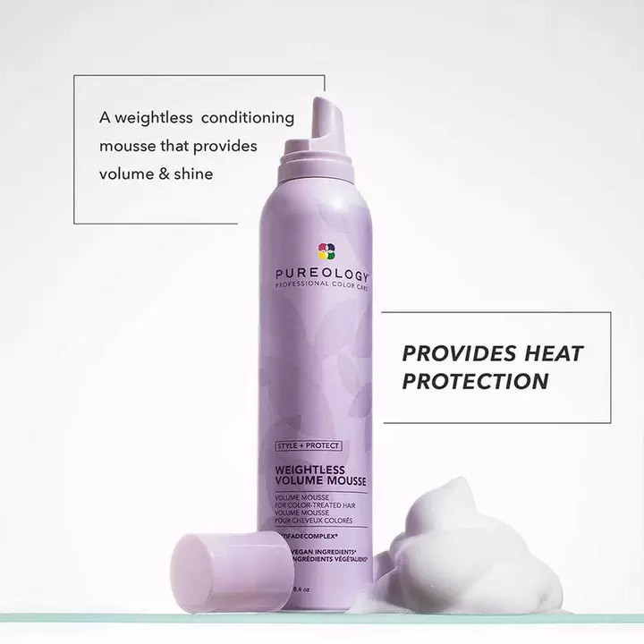 Pureology's Style + Protect Weightless Volume Mousse is a conditioning mousse that provides weightless volume, heat protection, and shine.
